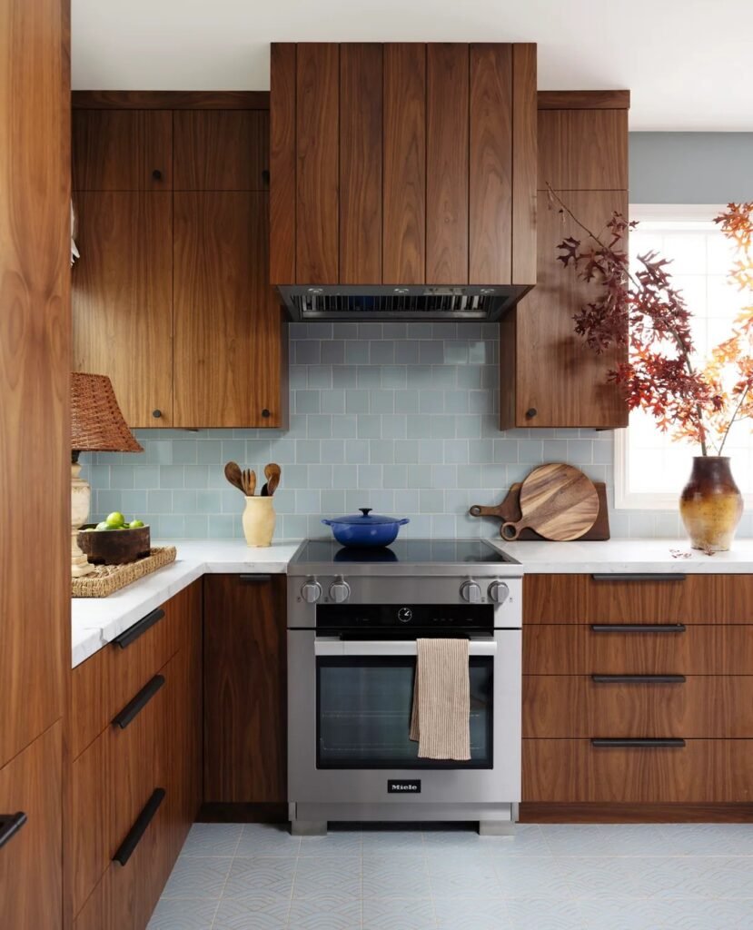 2. Moody Blue Zellige Tile with Walnut Cabinets
