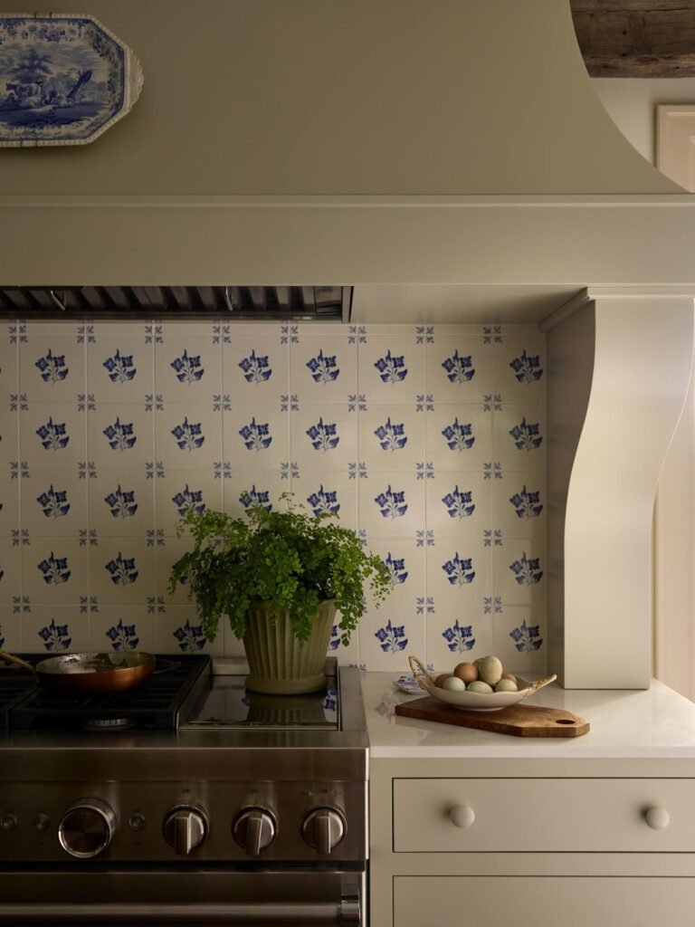 The Delft-style floral tiles feel like they’ve always been there — like this house was built around them.