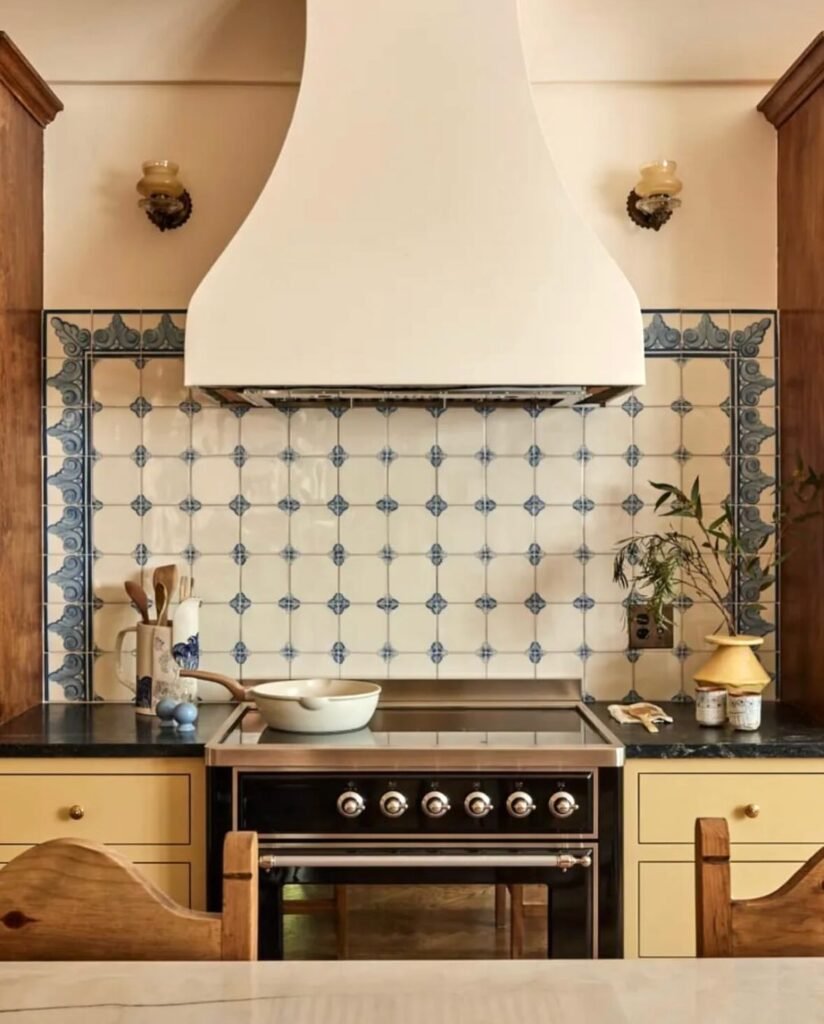 If you love pattern, this kitchen is your dream. Intricate blue and white encaustic cement tiles cover the entire backsplash in a bold medallion-style design that’s almost Moroccan in its richness.