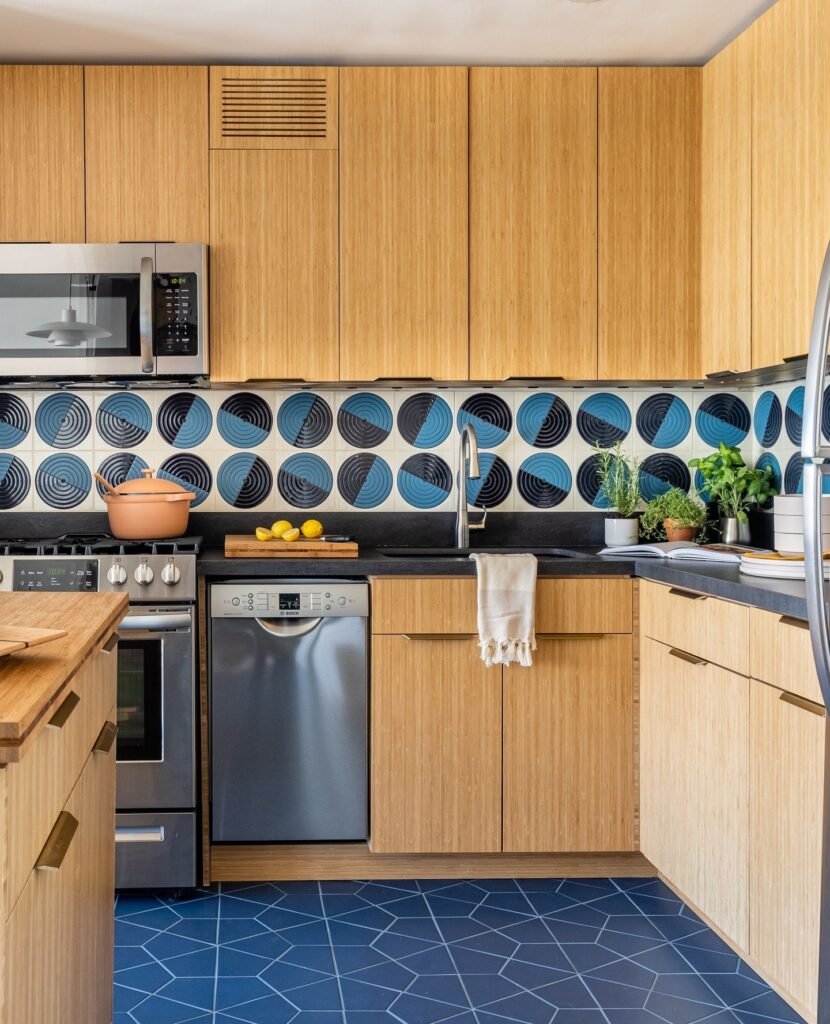 The pattern feels almost vintage, like something from a 1960s European kitchen, and against the natural bamboo-toned cabinetry it creates a really unexpected but cohesive pairing.