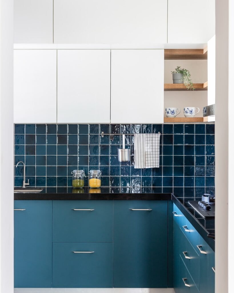 3. Teal Cabinet Kitchen with Glossy Square Tiles