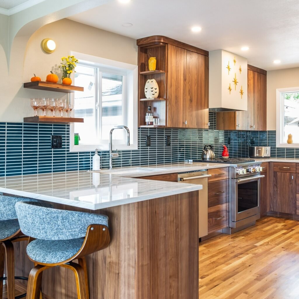 9. Mid-Century Walnut Kitchen with Teal Stacked Glass Tile