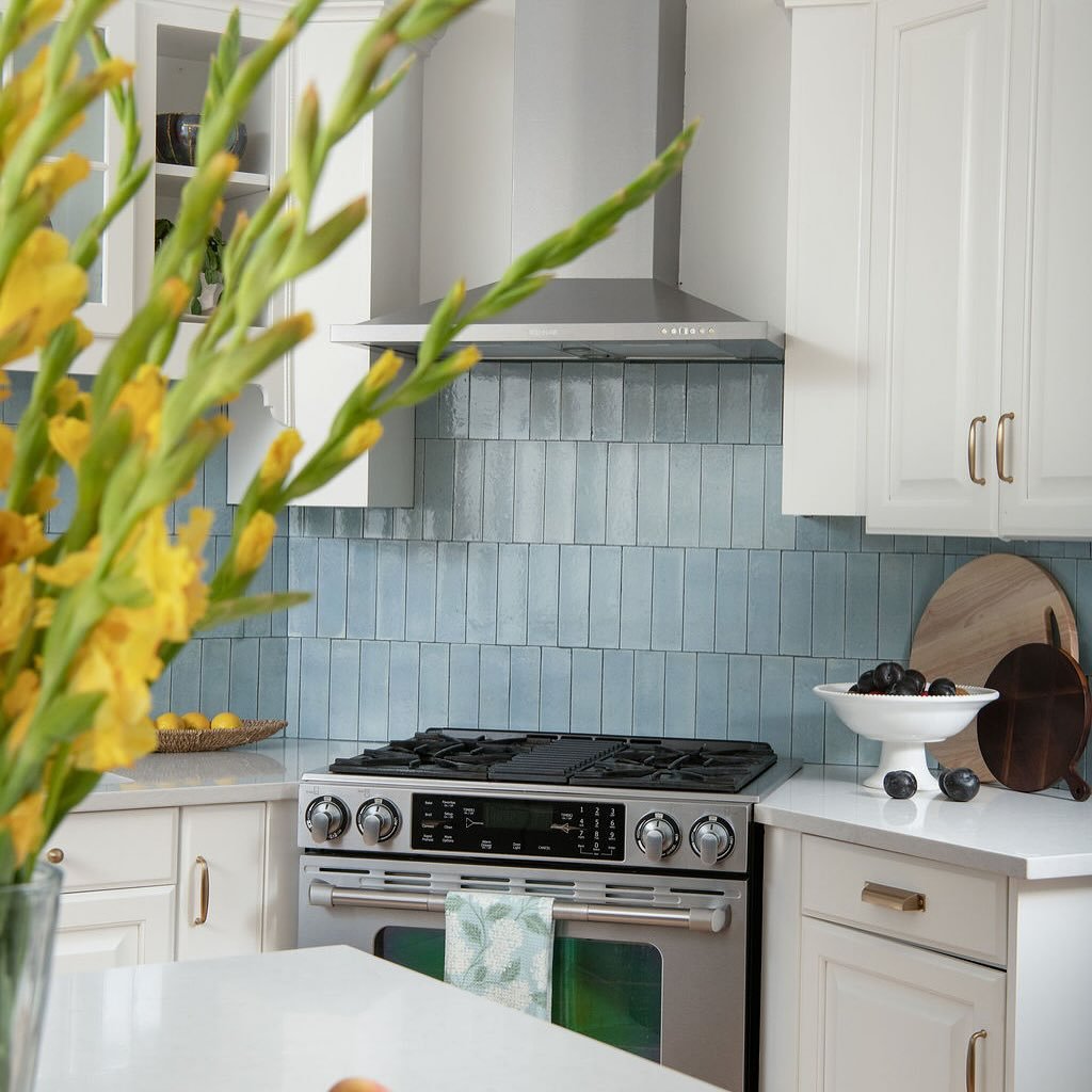 12. White Kitchen with Powder Blue Vertical Stack Tile