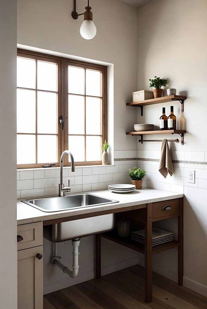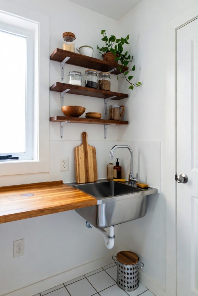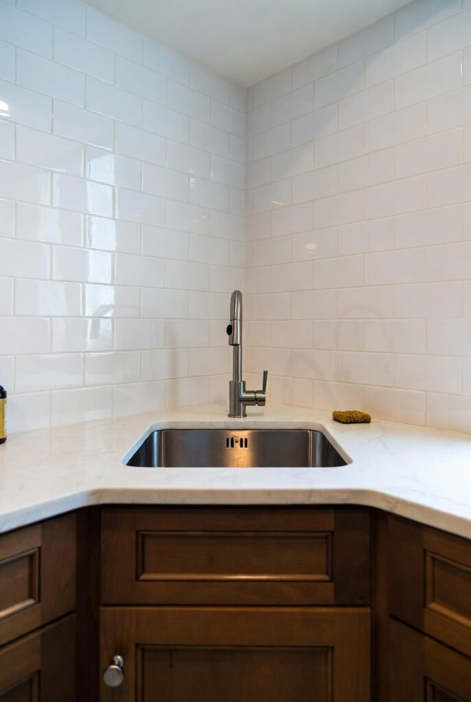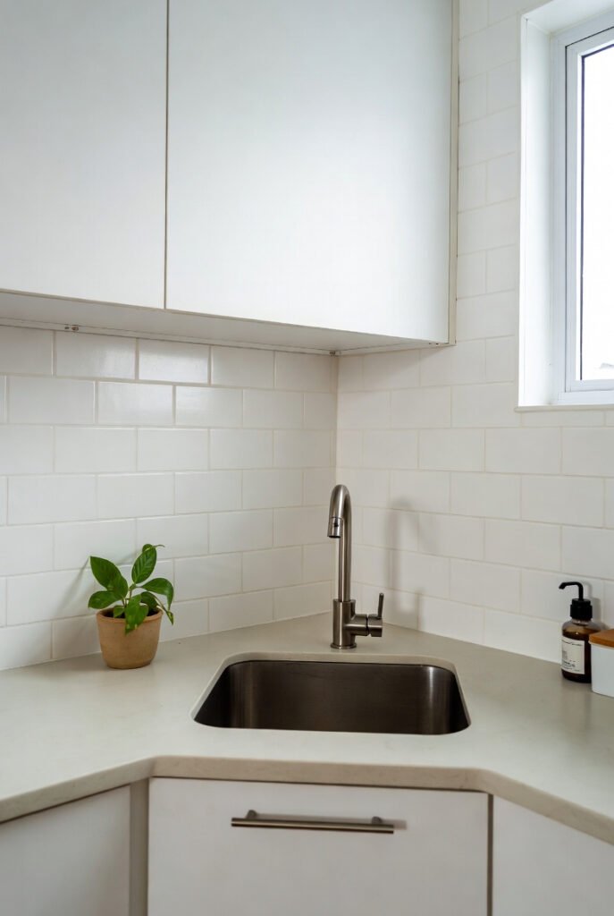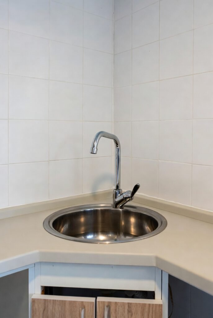 This petite setup demonstrates how corner sinks can work even in the tiniest kitchens, turning potential dead space into a fully functional zone.