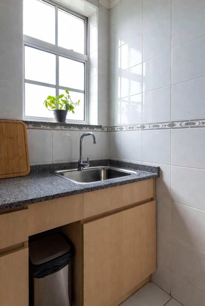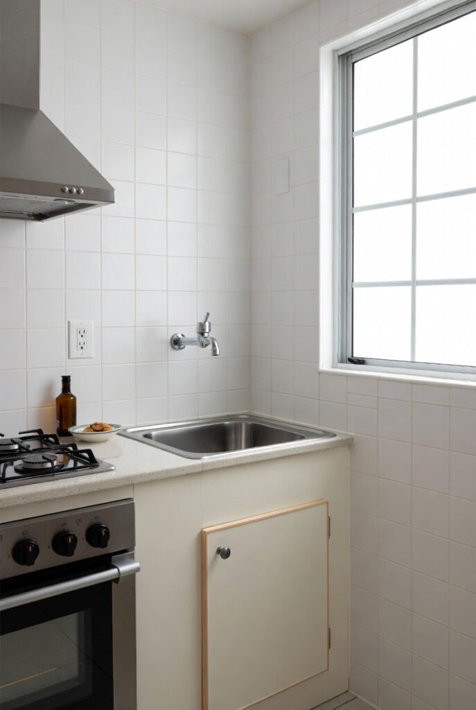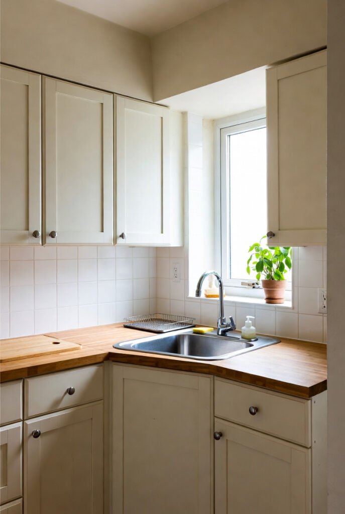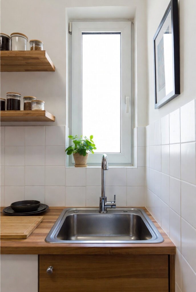 It’s an excellent example of how corner sinks work brilliantly in galley-style or studio apartment kitchens.