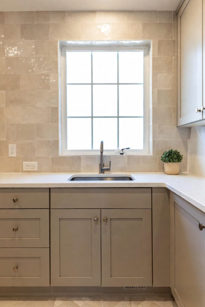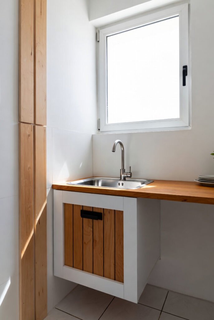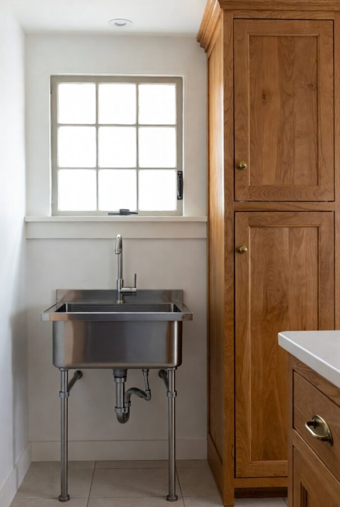 This setup works exceptionally well in laundry rooms, mudrooms, or compact urban kitchens where space-saving and style intersect beautifully.
