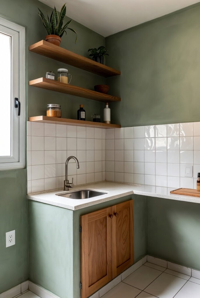 A moody sage green wall color transforms this corner sink area into something special.
