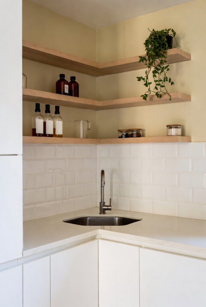 Natural wood floating shelves wrap around the corner above white subway tiles, offering spots for decorative bottles, plants, and essential storage jars.