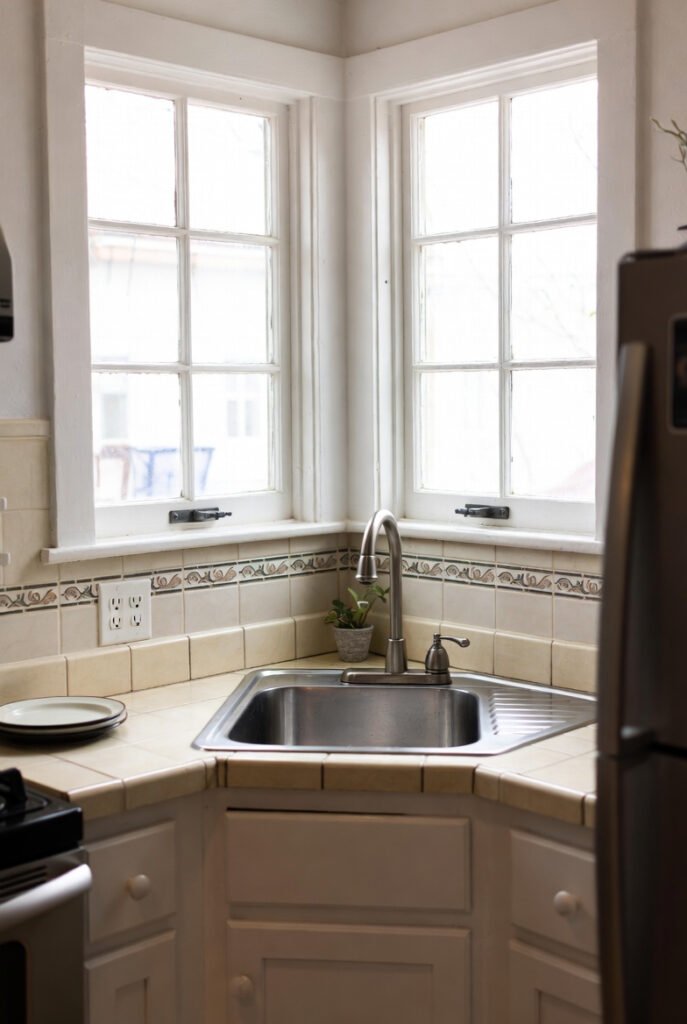 There’s something charming about a corner sink positioned beneath double windows that flood the space with natural light.