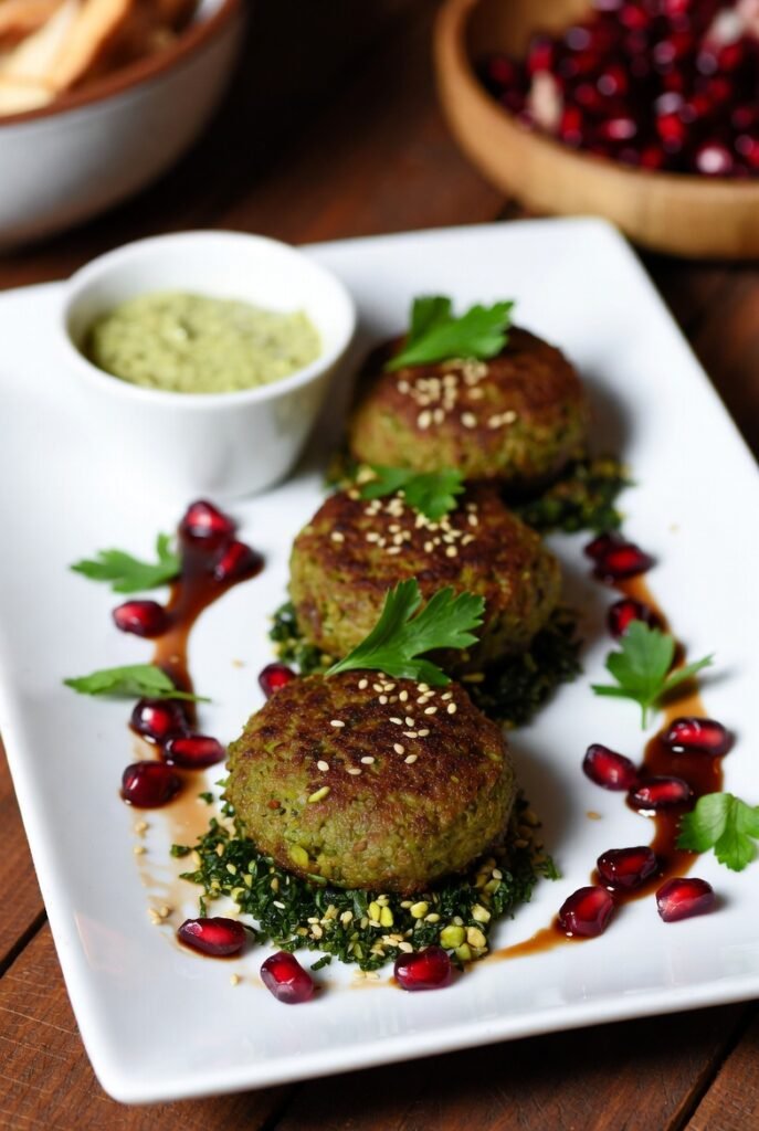 Pan-fried to golden perfection and served over a fresh herb mix, they get a drizzle of tangy pomegranate molasses and a creamy green dipping sauce on the side.