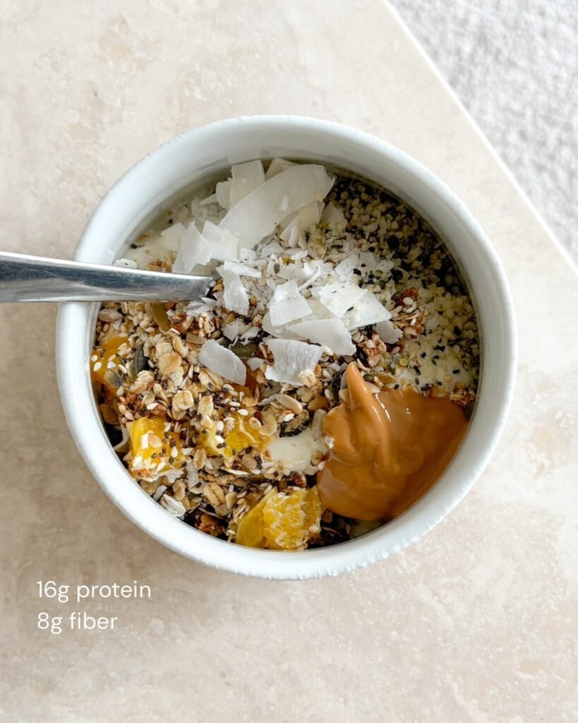 It clocks in at 16g protein and 8g fiber, which means you’re actually going to make it to 3pm without raiding the snack drawer.