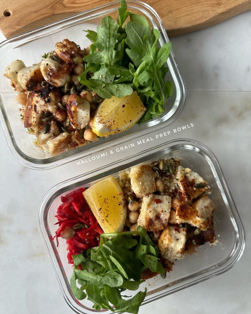 Crispy golden halloumi sitting on top of grains, chickpeas, arugula, and a squeeze of fresh lemon?