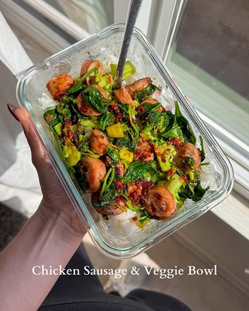 Sliced chicken sausage stir-fried with spinach, broccoli, and leeks over white rice — then finished with a spoonful of chili crisp that ties everything together.