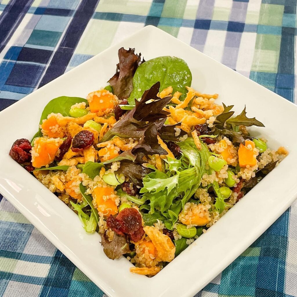 Quinoa mixed with roasted sweet potato chunks, edamame, dried cranberries, and crispy wonton strips over mixed greens.