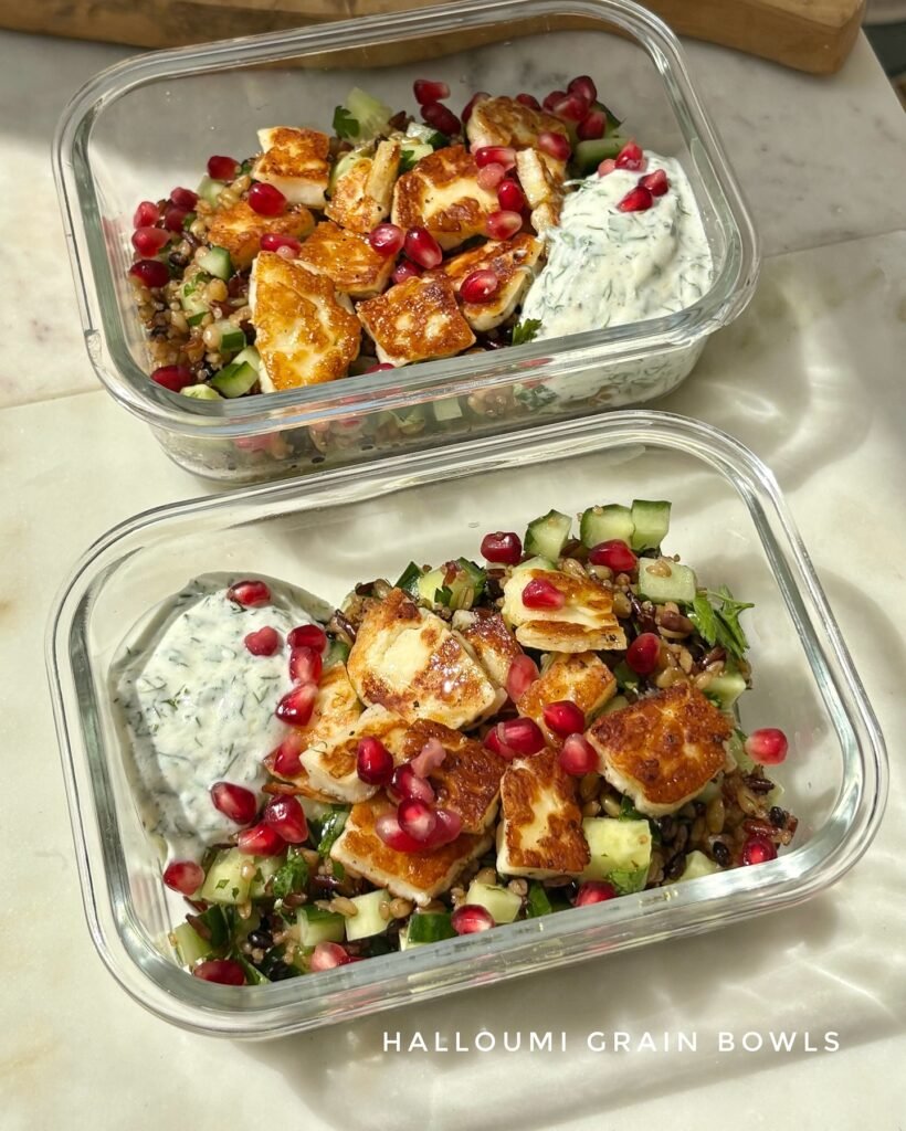 Pan-fried halloumi cubes with those gorgeous golden edges, scattered over a grain base with cucumber, pomegranate seeds, and a cool herby yogurt on the side. It’s fresh, filling, and has this lovely mix of textures.
