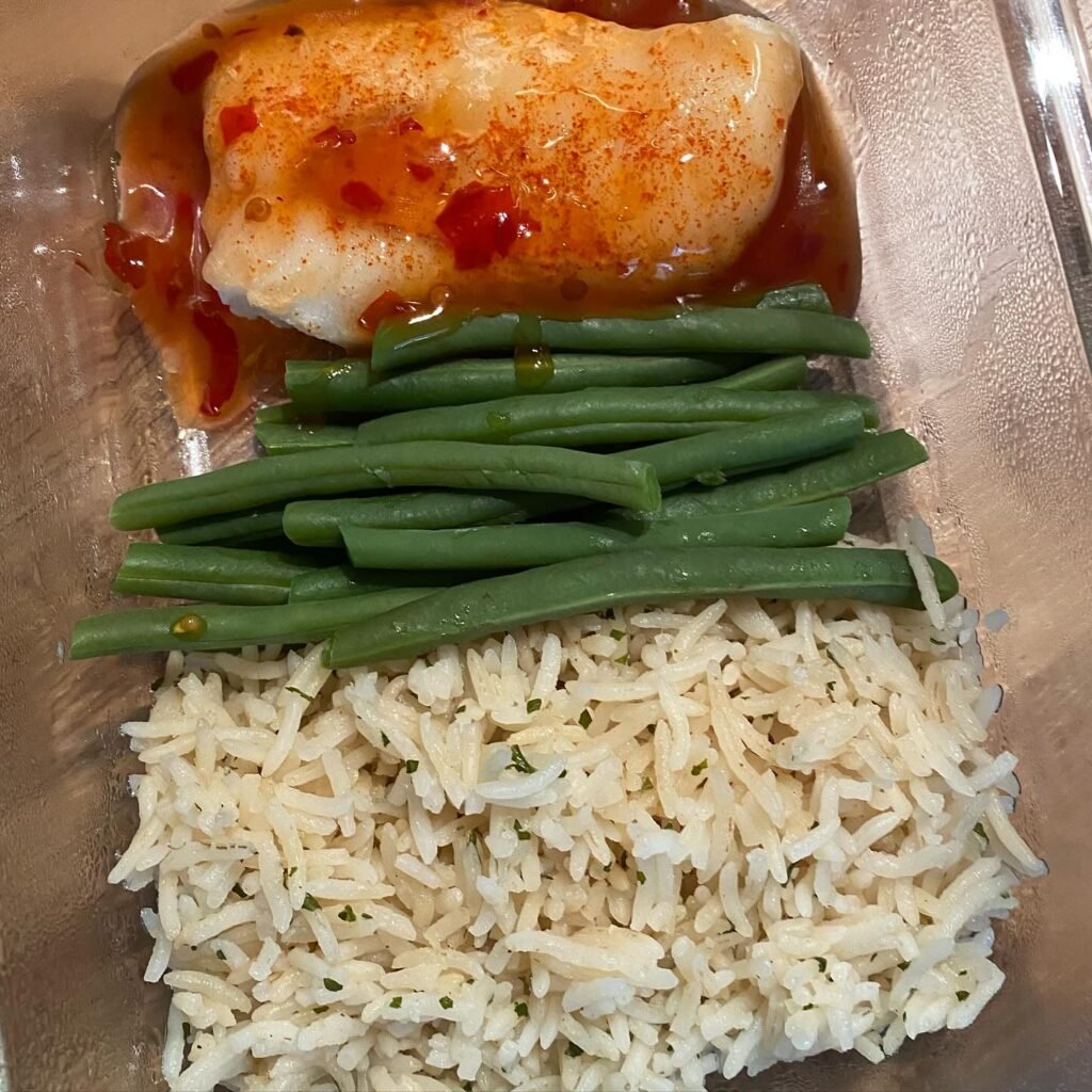 A fish fillet baked in sweet chili sauce, served alongside steamed green beans and herbed rice — all in a glass meal prep container.