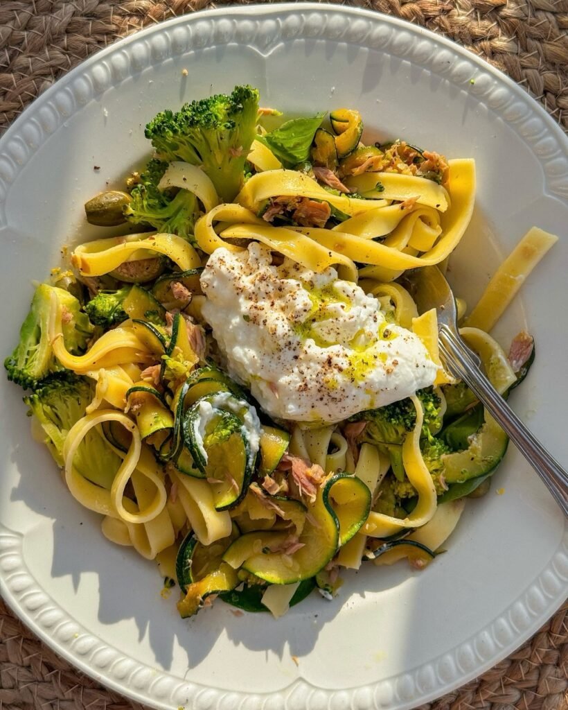 Wide tagliatelle noodles tossed with zucchini ribbons, broccoli, flaked tuna, and olives — then finished with a big dollop of creamy burrata on top.