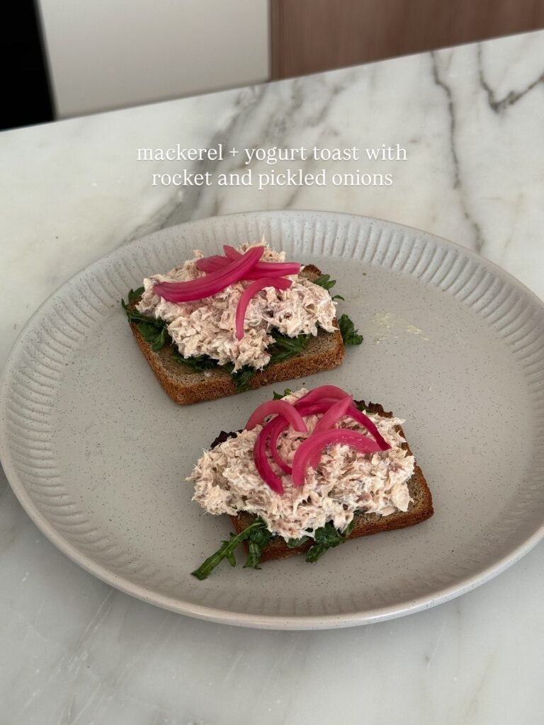 Smoked mackerel mixed with creamy yogurt, piled onto toasted brown bread with rocket underneath and pickled onions on top.