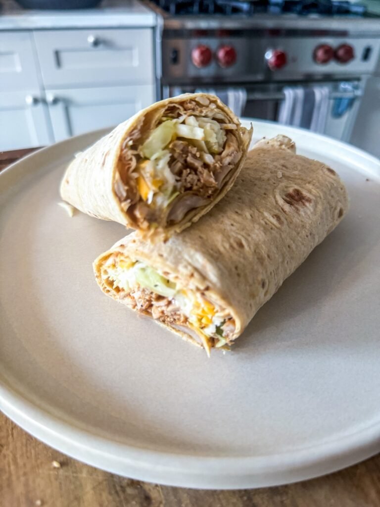 Shredded chicken in a smoky BBQ sauce, melted cheddar, crunchy lettuce, all rolled up tight in a tortilla.