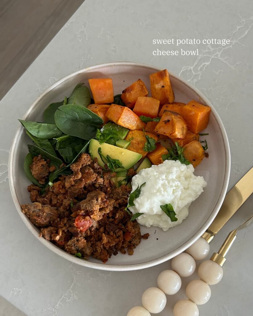 Roasted sweet potato cubes with those caramelized edges, seasoned ground meat, fresh spinach, sliced avocado, and a big scoop of cottage cheese bringing in that creamy protein boost.