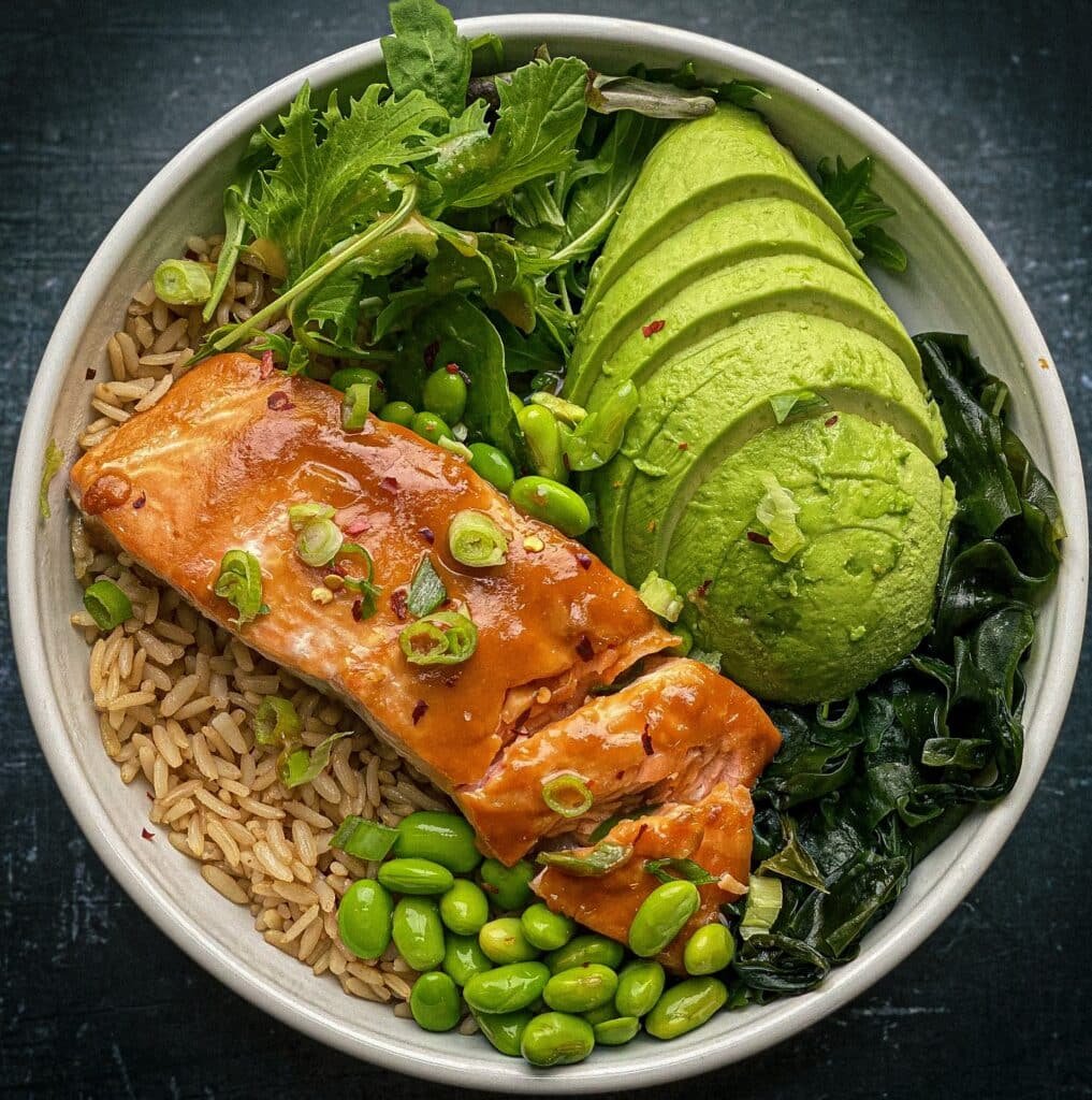 This bowl is giving everything — glossy teriyaki salmon, brown rice, creamy sliced avocado, edamame, seaweed, and fresh greens all in one beautiful dish.