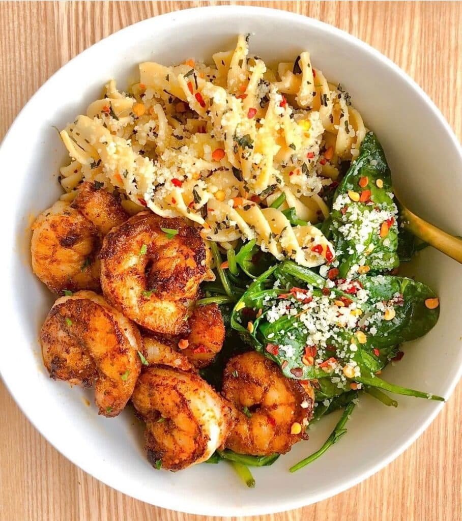 Boldly seasoned cajun shrimp sitting next to light pasta tossed in garlic and olive oil, with fresh spinach and arugula finished with parmesan and chili flakes.