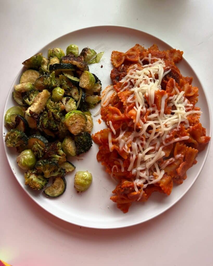 This plate is just comforting, simple, and satisfying — gluten free farfalle tossed in a rich tomato sauce with shredded cheese, sitting next to a pile of roasted brussels sprouts, zucchini, and broccoli.