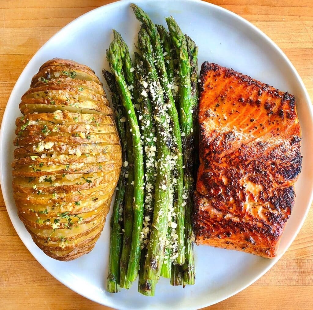 A beautifully spiced blackened salmon fillet, crispy hasselback potato with garlic butter soaking into every single slice, and roasted asparagus with a sprinkle of parmesan.