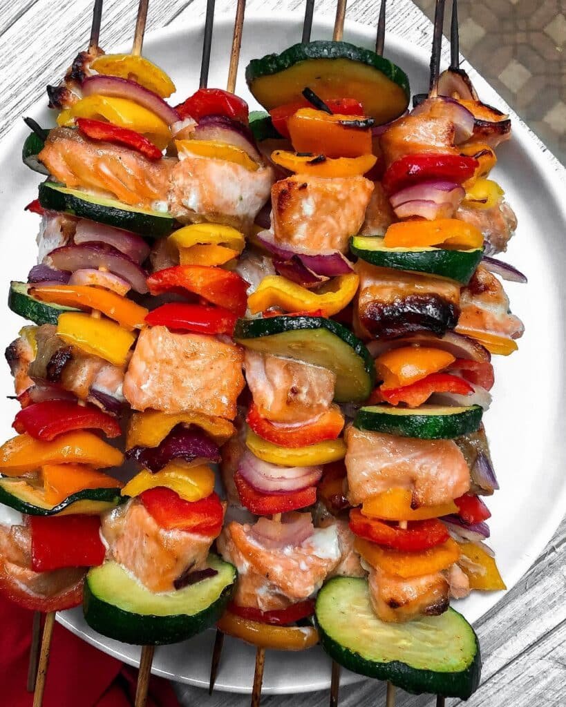 These skewers are loaded with chunks of fresh salmon, colorful bell peppers, zucchini, and red onion — all grilled until slightly charred and absolutely delicious.