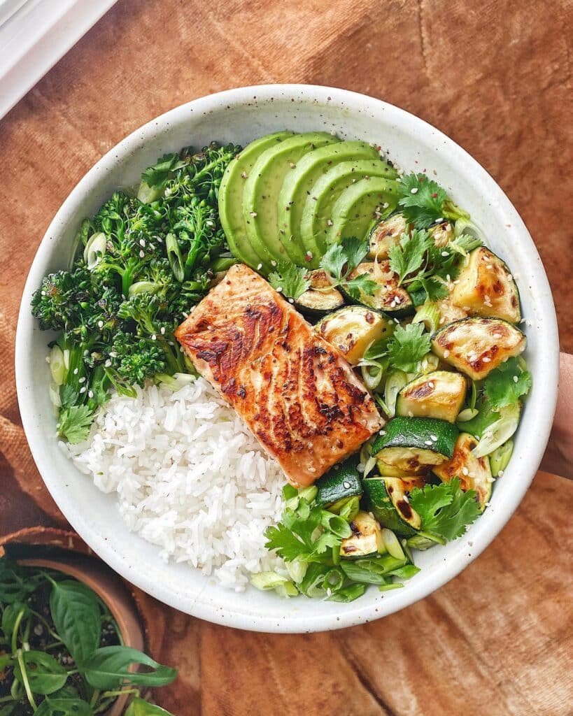 Fresh, vibrant, and loaded with good stuff — this bowl has miso glazed salmon, white rice, roasted broccolini, sautéed zucchini, creamy avocado slices, cilantro, and sesame seeds.