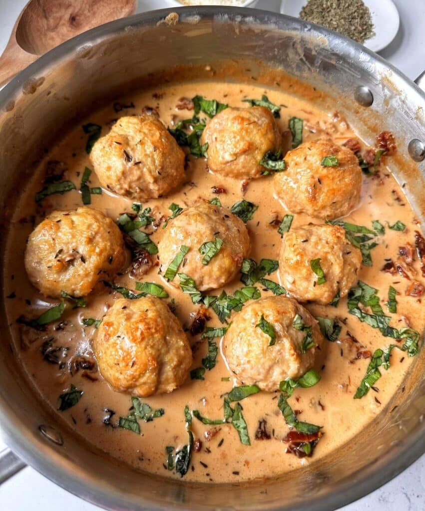 5. Tuscan Chicken Meatballs in Creamy Sun-Dried Tomato Sauce