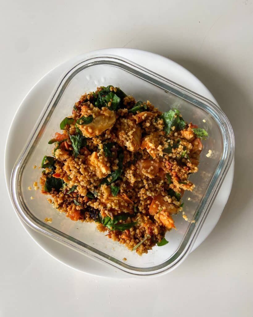 This is the kind of lunch or dinner that actually keeps you full — quinoa tossed with flaked salmon, wilted spinach, and roasted tomatoes all mixed together with a smoky seasoning that ties everything together.