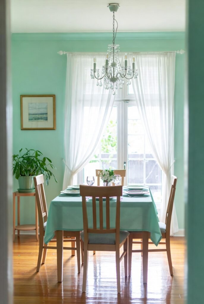 Pale mint walls create a gentle, romantic atmosphere perfect for intimate gatherings.