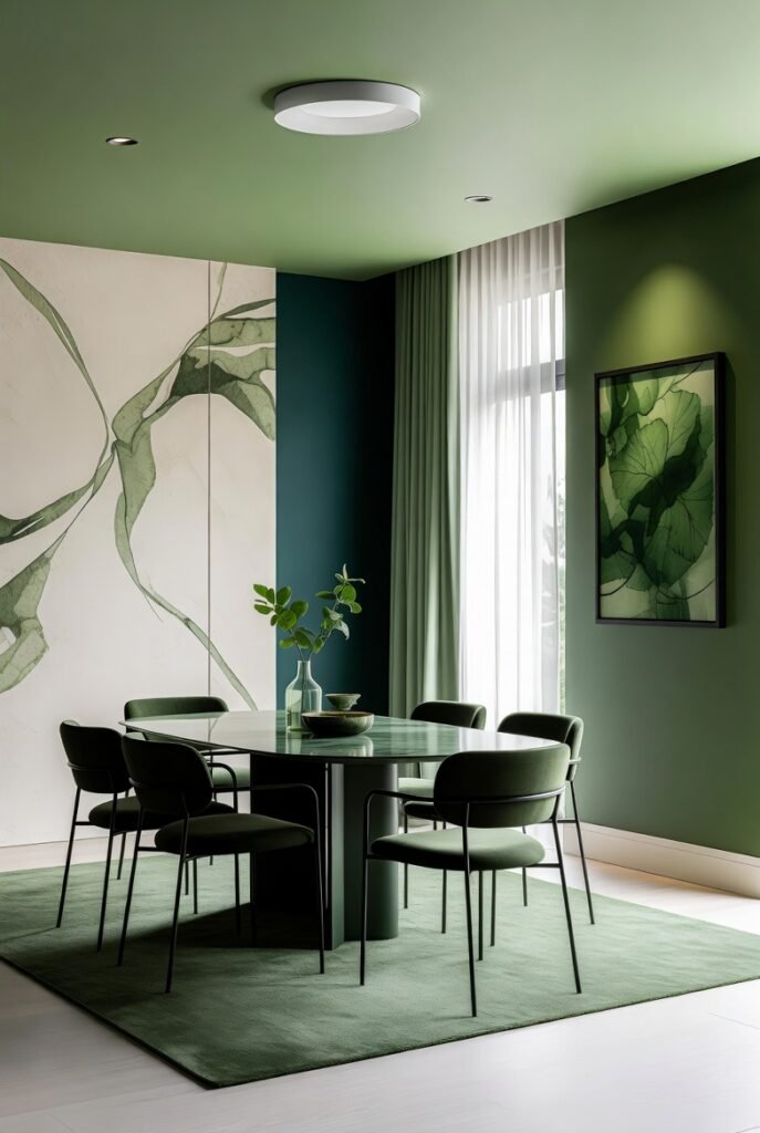 Sometimes contrast is everything. Here, dark green creates a striking accent wall while lighter greens keep the overall feel balanced.
