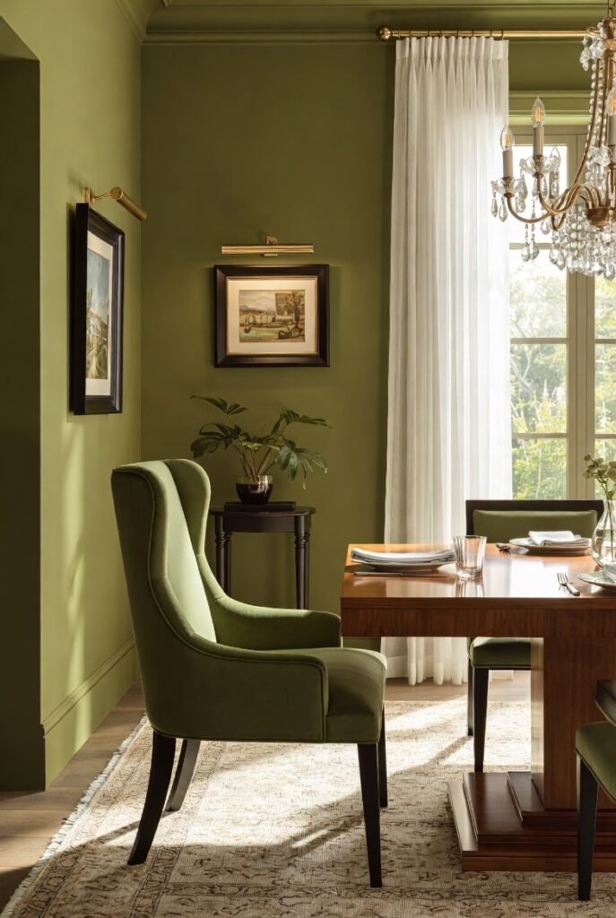This room shows how darker greens can feel luxurious rather than oppressive when balanced thoughtfully.