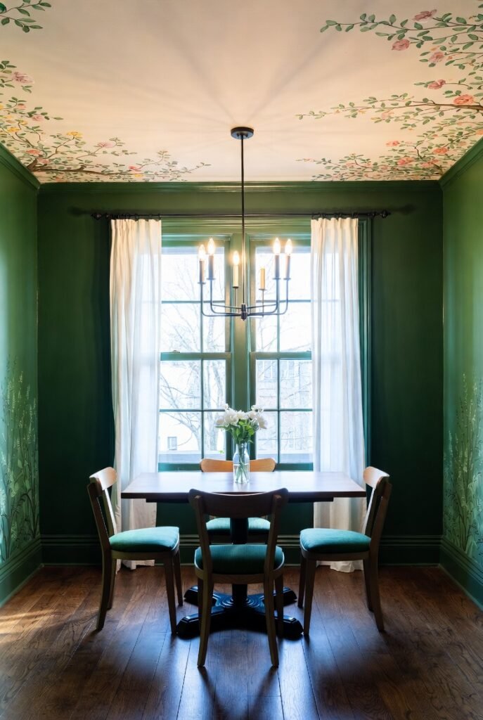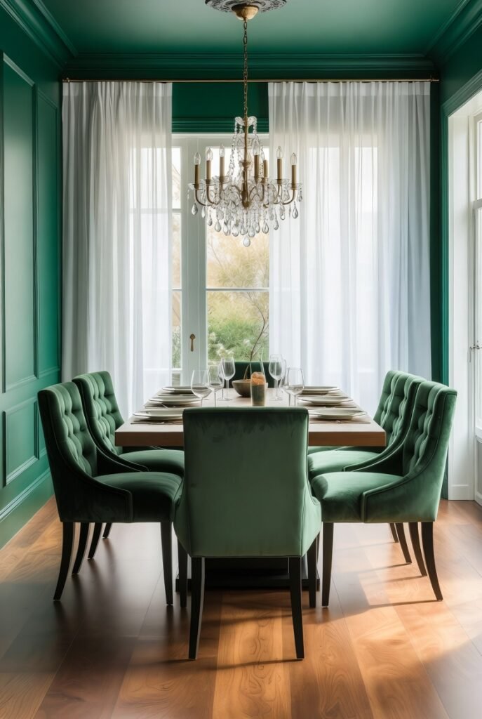 This room embraces richness with deep emerald walls and ceiling, creating an enveloping, intimate atmosphere perfect for long dinners.