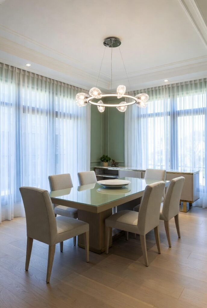 The upholstered chairs in complementary green tones add comfort without sacrificing style, while the modern chandelier brings contemporary flair.