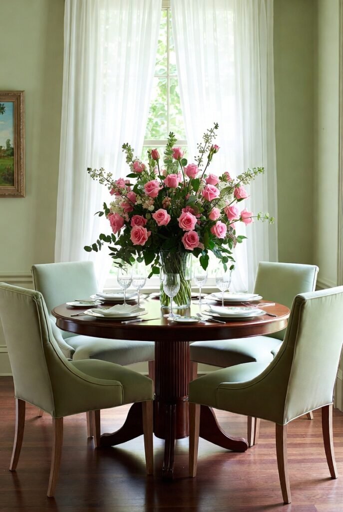That generous rose arrangement makes a spectacular centerpiece—fresh flowers truly transform a space.