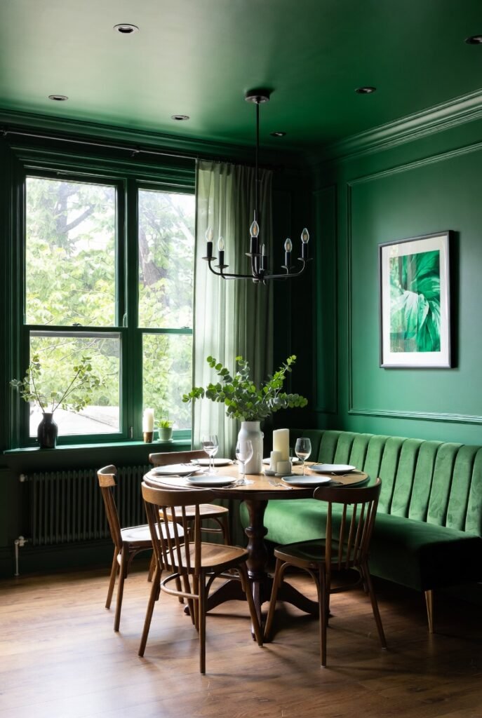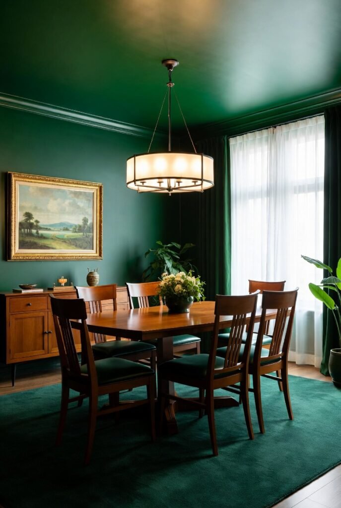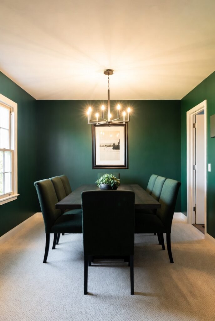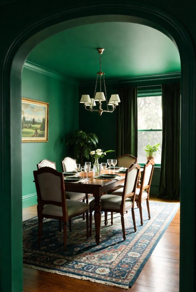 Rich emerald walls combined with darker trim create depth that flat color simply cannot achieve.
