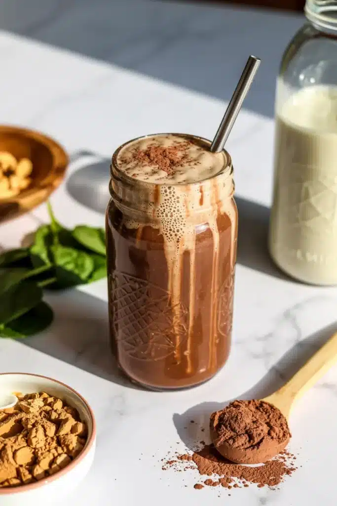 Blend one scoop of your favorite chocolate whey or plant-based protein powder (usually around 120 calories and 24g protein) with one cup of unsweetened almond milk, a handful of spinach (you won’t taste it, promise), and one tablespoon of peanut butter powder. Peanut butter powder is a great hack—it gives you the flavor of peanut butter with a fraction of the fat calories. Add ice to thicken it up for a milkshake-like texture.