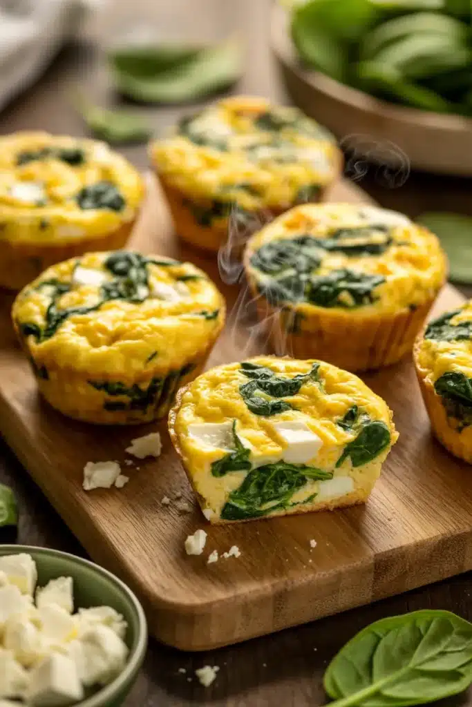 Whisk together 6 large eggs and a splash of milk. Stir in a cup of chopped fresh spinach and a quarter cup of crumbled feta cheese. Pour the mixture evenly into a lightly greased 12-cup muffin tin and bake at 350°F (175°C) for about 20 minutes.