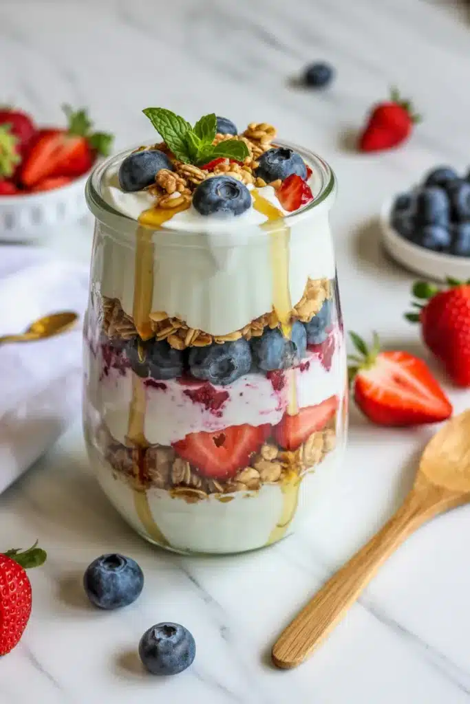 To make this parfait, start with that 170g base of plain nonfat Greek yogurt. Top it with half a cup of mixed berries (strawberries, blueberries, or raspberries) for fiber and antioxidants. Finish it off with an ounce of chopped walnuts or almonds for healthy fats and a satisfying crunch.
