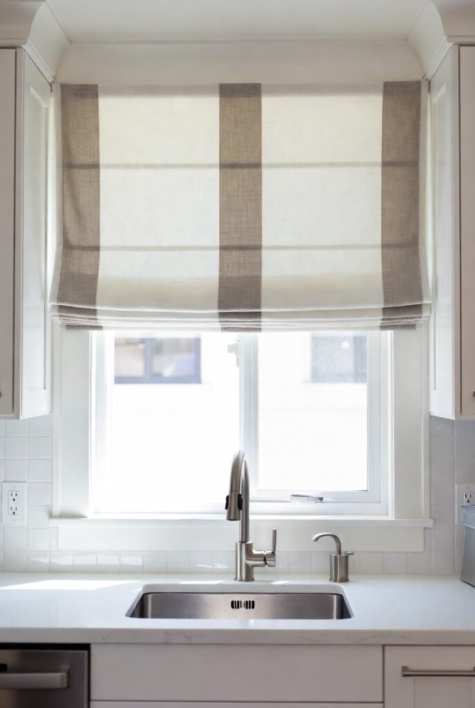 This linen Roman shade with wide gray stripes adds just the right amount of pattern without feeling too busy. It’s pulled halfway down, letting in plenty of light while still giving the window some personality.