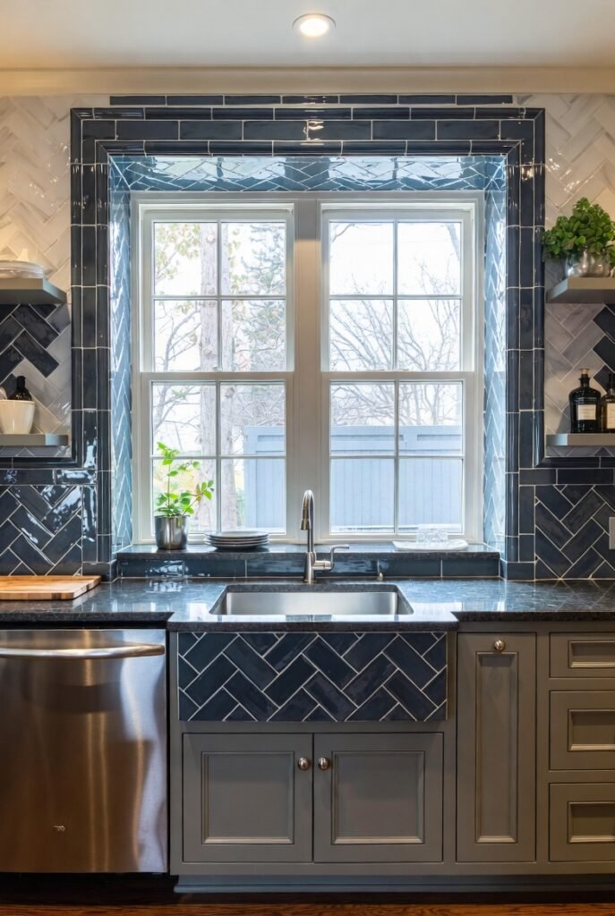 Deep navy herringbone tiles surround the window like a frame, creating an architectural moment that stops you mid-step.