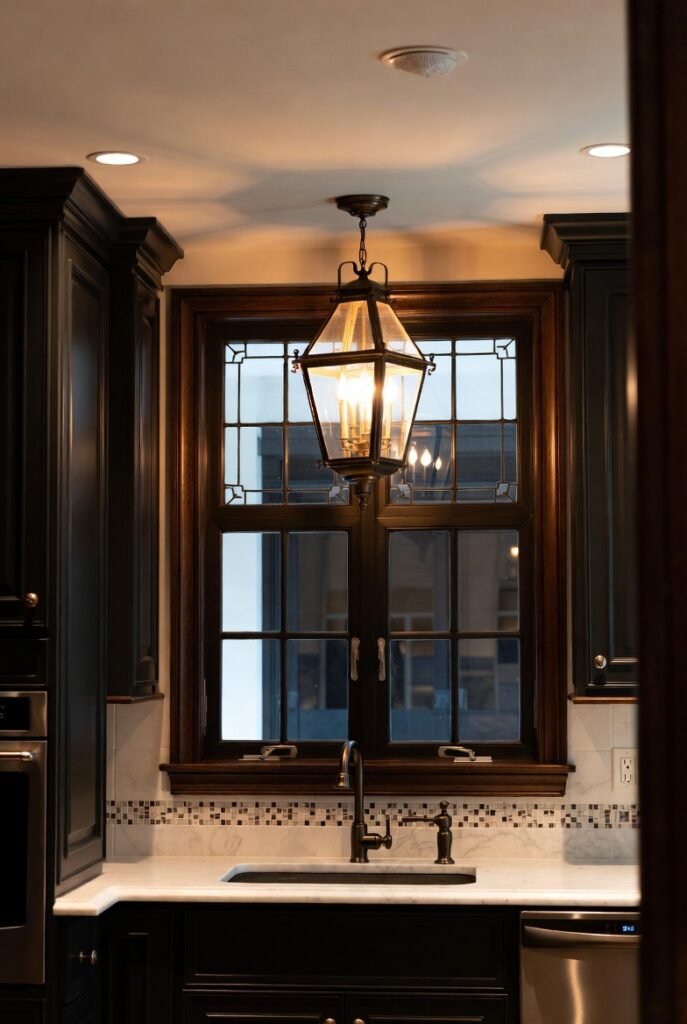 If your kitchen leans traditional or you’re drawn to old-world design, anchoring a statement pendant over the sink window is a move that rarely disappoints.
