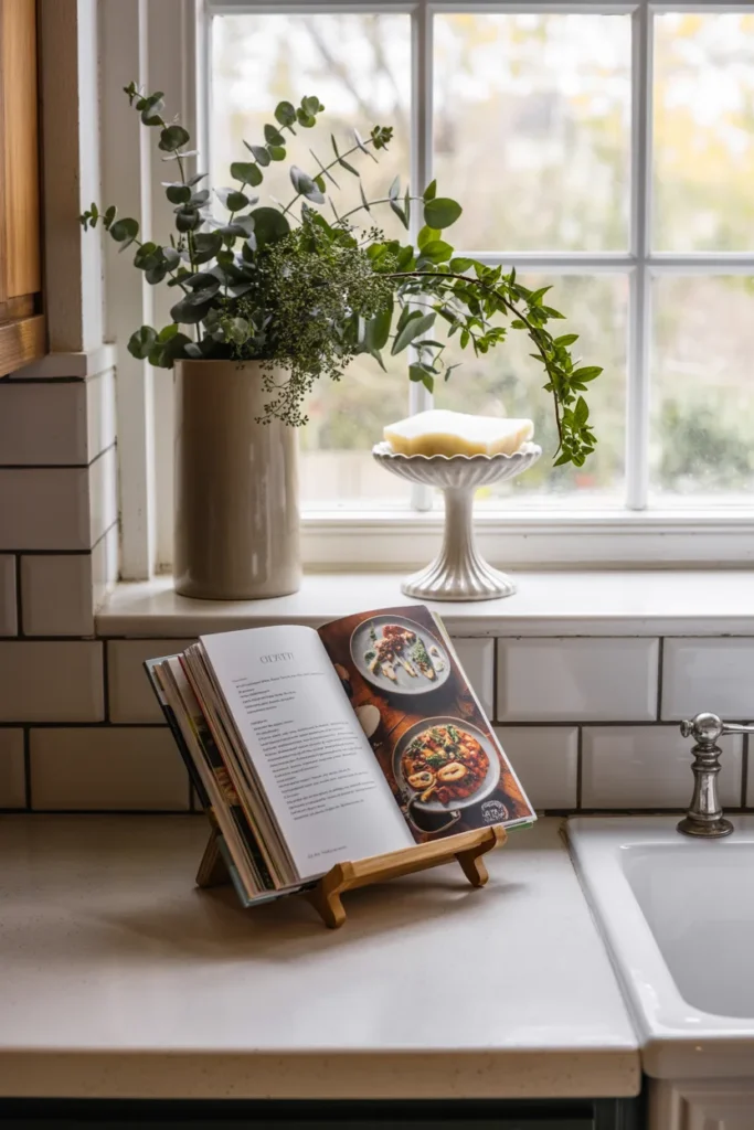 This windowsill is styled with eucalyptus stems in a ceramic vase, a bar of soap on a pretty cake stand, and an open cookbook propped in front.