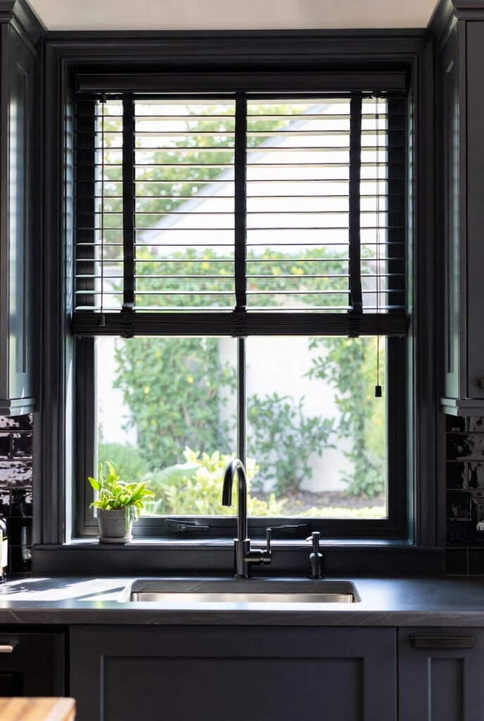3. Matte Black Blinds in a Dark Kitchen