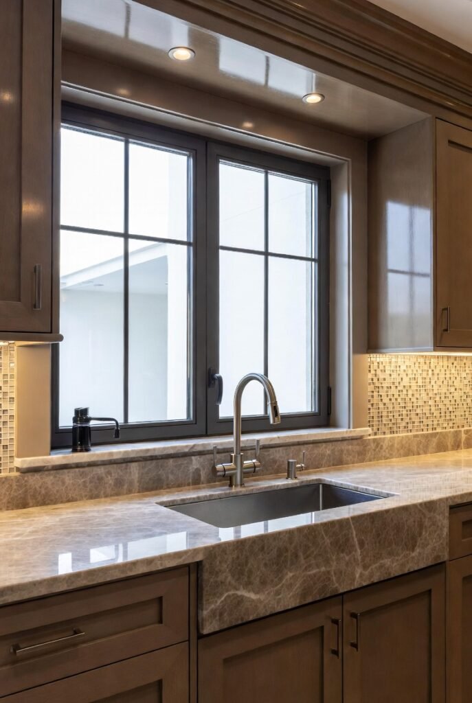 Dark casement windows with slim grid lines sit above a genuinely gorgeous stone countertop — that veining is absolutely wild.