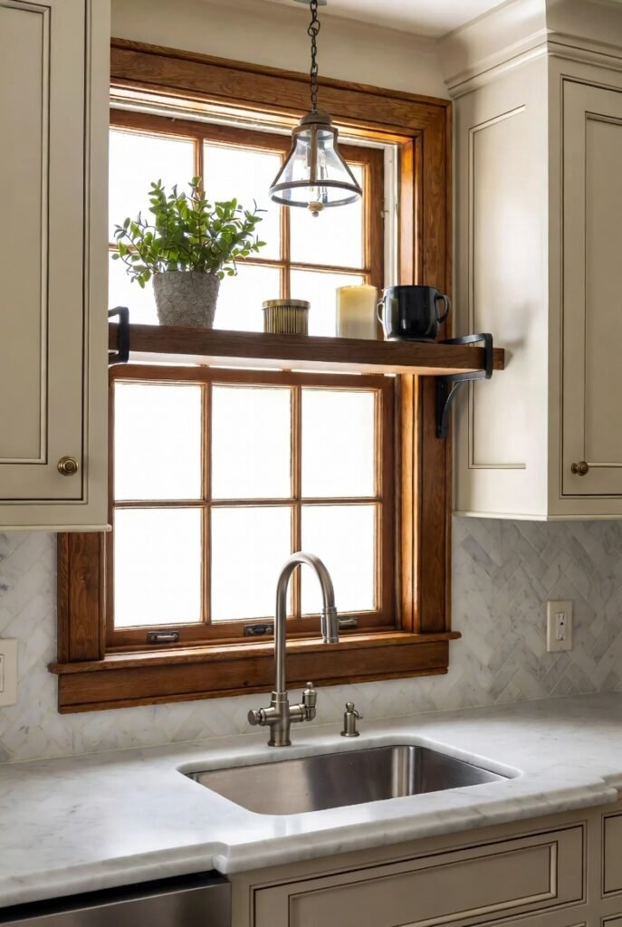 This idea is genuinely clever — a floating walnut shelf spans the middle of the window, creating a little display ledge without blocking too much light.