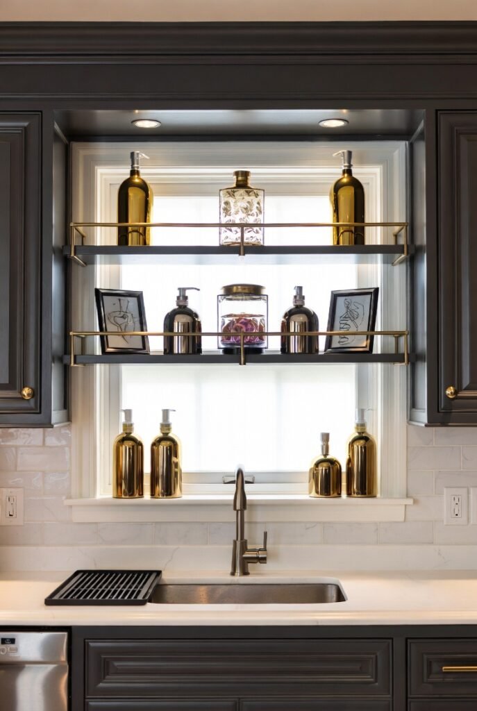 Instead of a window treatment, this kitchen went with tiered metal shelves mounted directly across the window — and the result is dramatic in the best way.